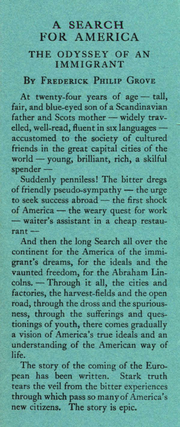 Grove, Frederick Philip. A Search for America. Montreal: Louis